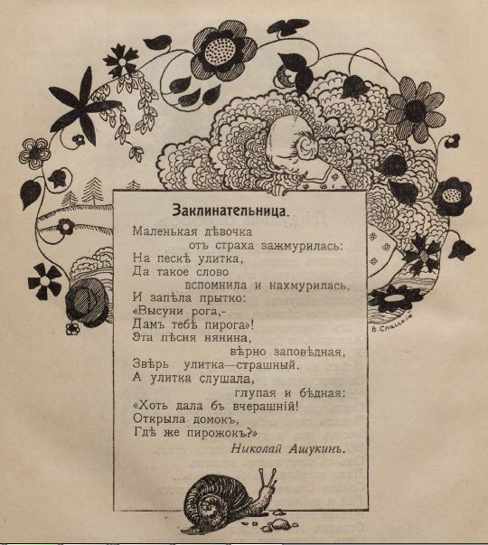 - Николай Ашукинъ. Заклинательница (стихотворение, иллюстрации В.В. Спасского), стр. 30
