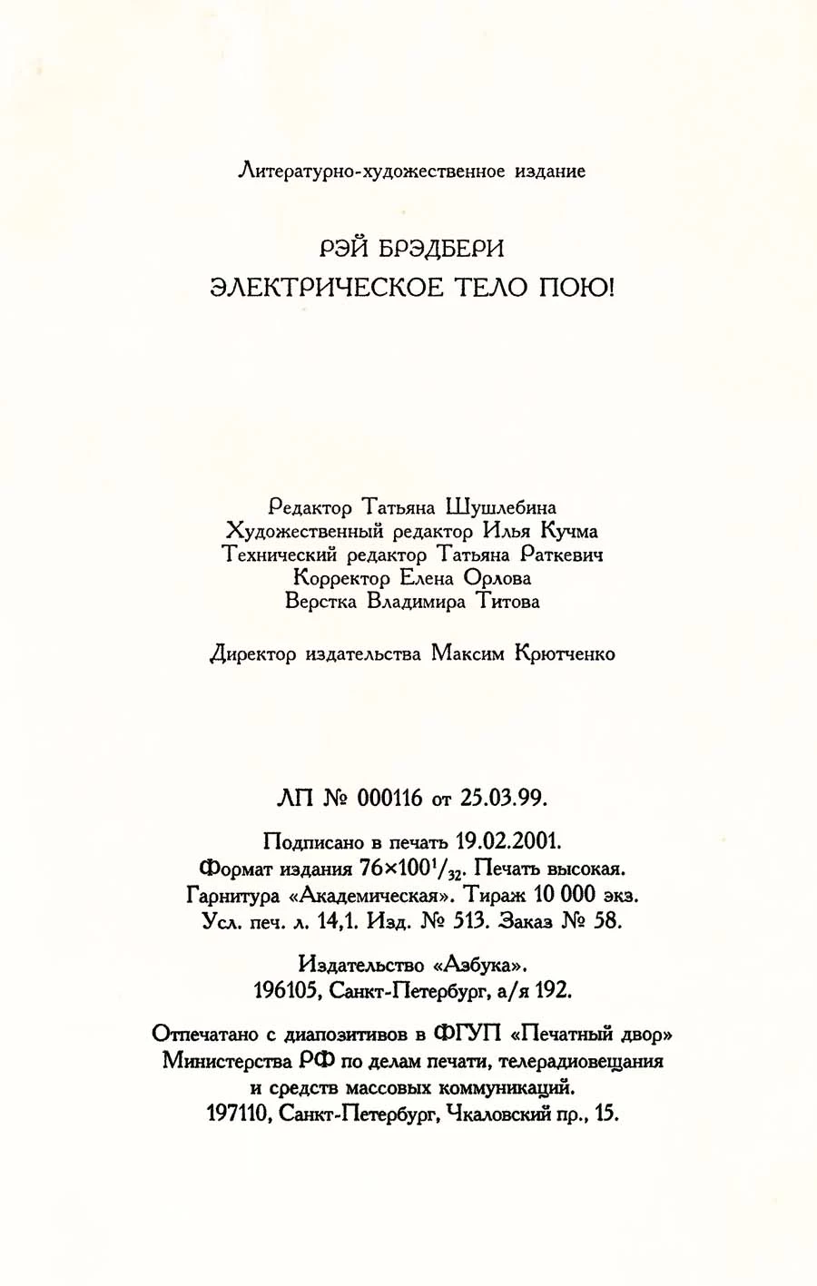 - Рэй Брэдбери. Электрическое тело пою! (рассказ, перевод Т. Шинкарь), стр. 74-127