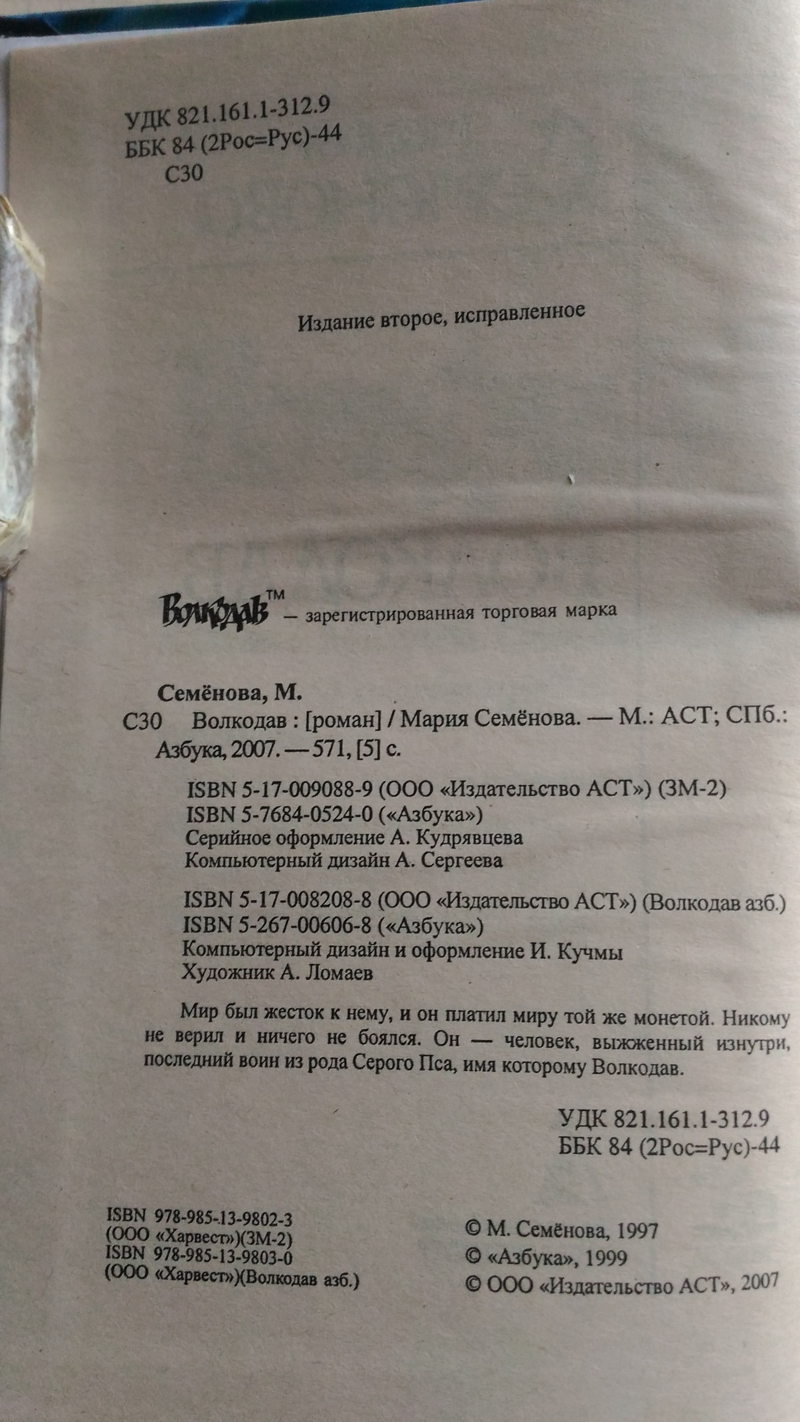 Описание: Первый роман из цикла «Волкодав». Иллюстрация на обложке П. Борозенца (в издании не указан). Содержание: