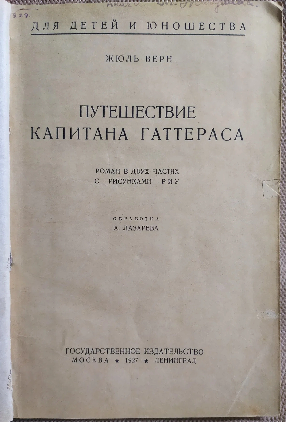 В следующем, 1928 году было напечатано второе издание этой книги. Информация из карточки РНБ: Верн, Жюль. Путешествие капитана Гаттераса: Роман в 2 частях, с рис. Риу. 2-е изд. — Москва; Ленинград: Гос. изд-во, 1928. Обработка А.Лазарева, под ред. и с послесл. М.С. Боднарского. — 382 с.