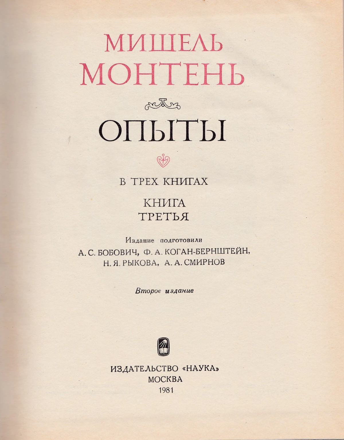 Примечание: Второе издание. Художественное оформление В. Виноградова. Издание подготовили: А. С. Бобович, Ф. А. Коган-Бернштейн, Н. Я. Рыкова, А. А. Смирнов. Книга третья. Главы I-VI и IX-X переведены А. С. Бобовичем, главы VII-VIII, XI-XXIII — Н. Я. Рыковой. Редакция переводов Ю. Н. Стефанова. Общая редакция Ю. Б. Виппера. На фронтисписе: «Монтень в шляпе». Портрет Этьена де Мартелланжа. Конец XVI в. + Вклейка 2-х листов (4 стр.) иллюстраций вне пагинации. Подписано в печать 3.04.81.