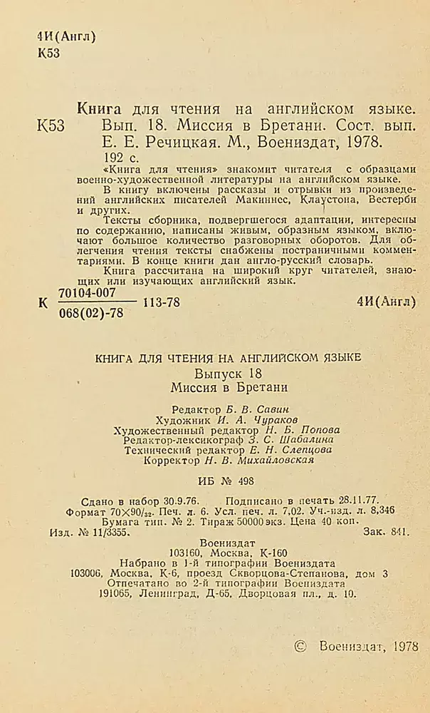 Описание: Книга для чтения на английском языке. Выпуск 18. Иллюстрация на обложке И. Чуракова. Содержание: