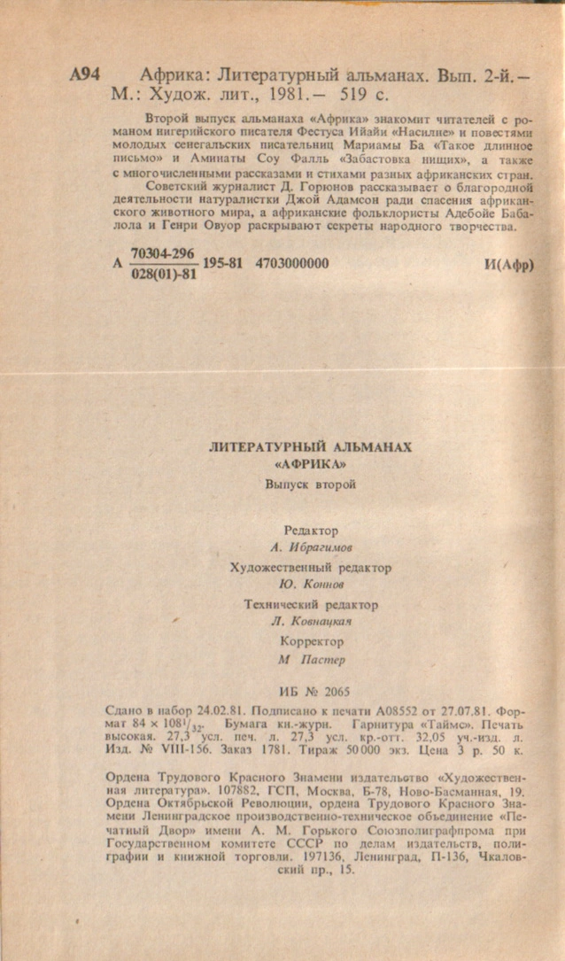 - Мариама Ба. Такое длинное письмо (повесть, перевод М. Архангельской), стр. 21-92