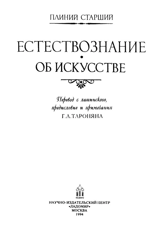 - Плиний Старший. Естествознание. Об искусстве (энциклопедия/справочник, перевод Г. Тароняна)