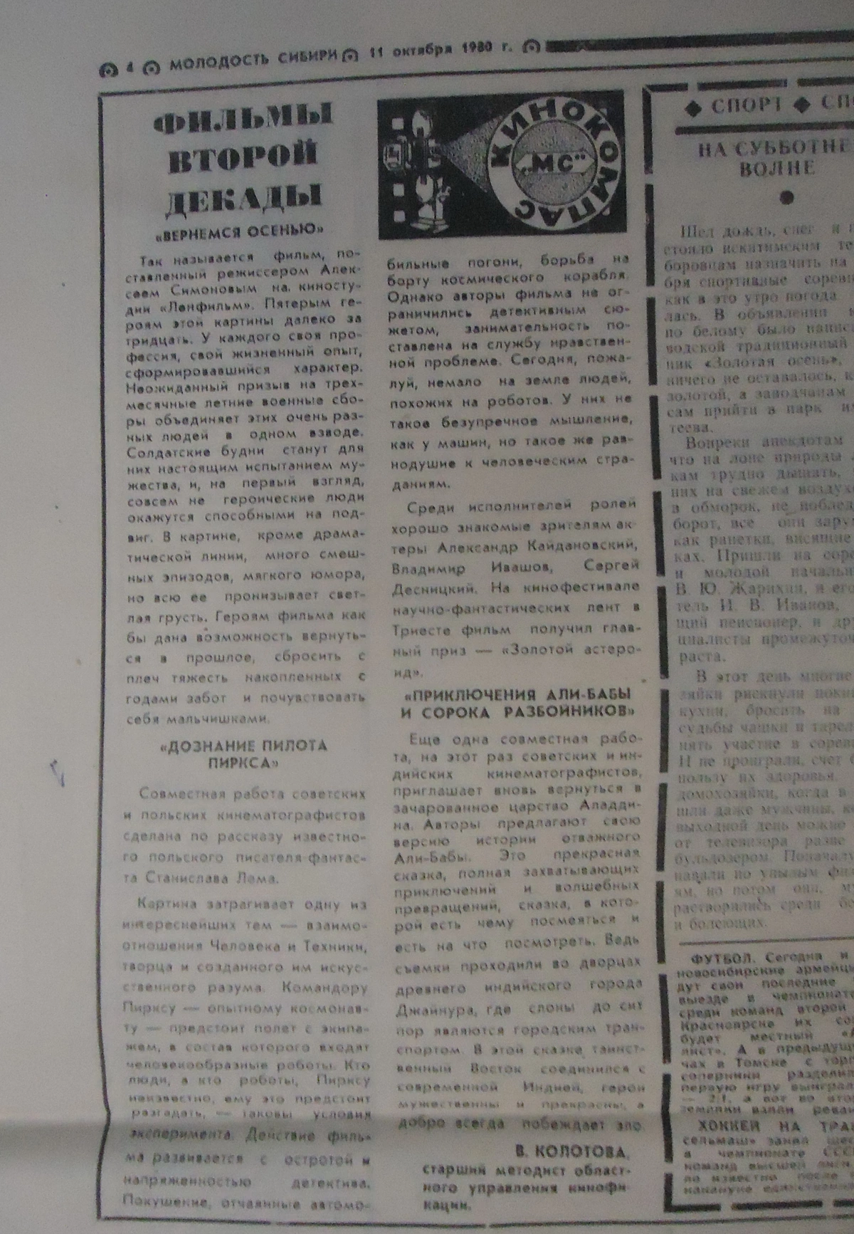 «Молодость Сибири, №123 (7590) от 11 октября 1980 г.»
