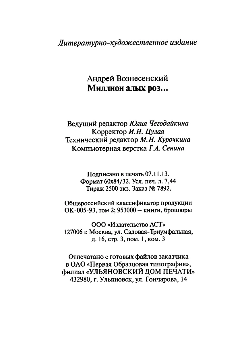 - Андрей Вознесенский. Миллион роз (стихотворение), стр. 156-157