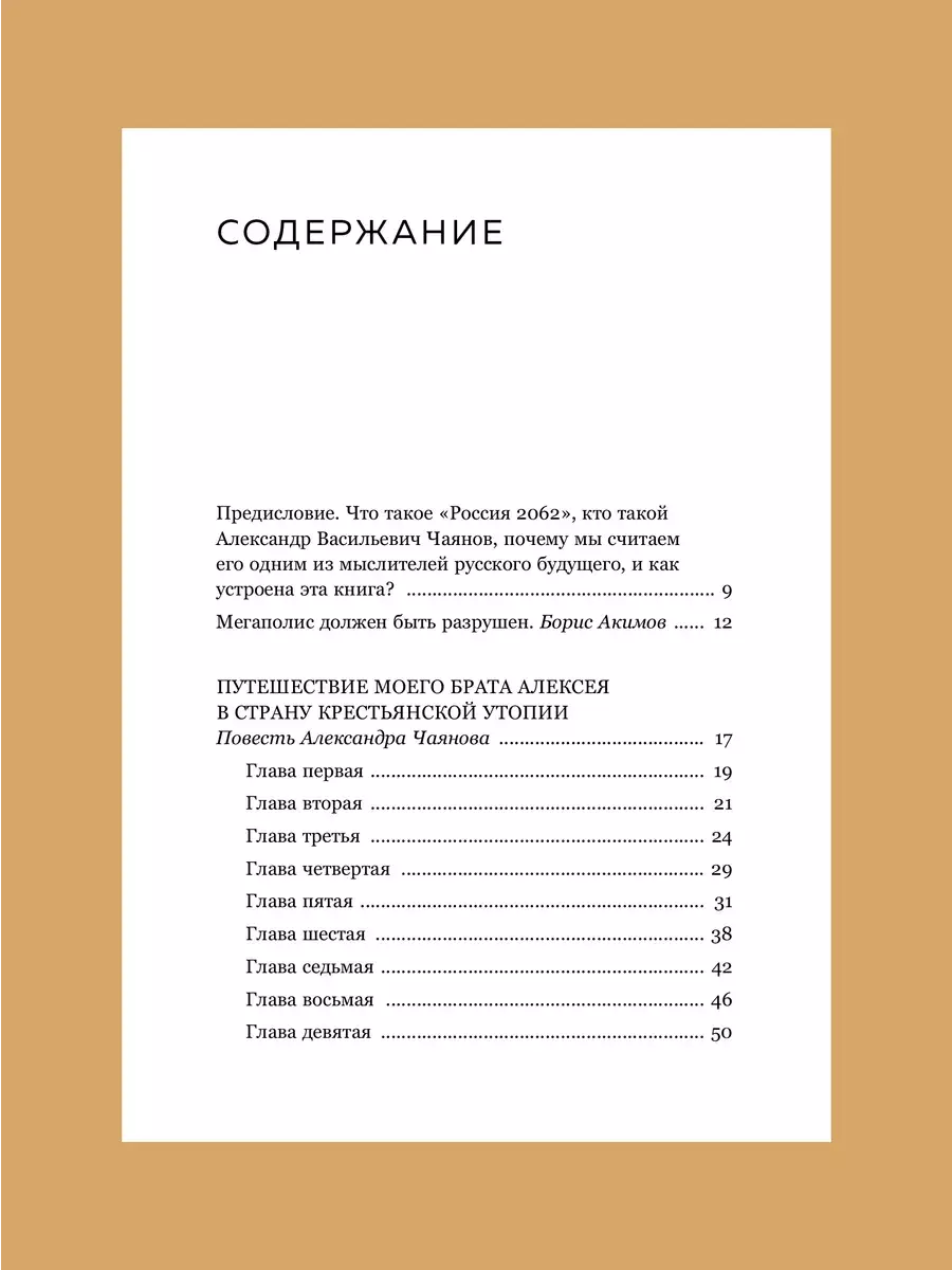 - Борис Акимов. Предисловие. Что такое «Россия 2062», кто такой Александр Васильевич Чаянов, почему мы считаем его одним из мыслителей русского будущего, и как устроена эта книга?, стр. 9-11