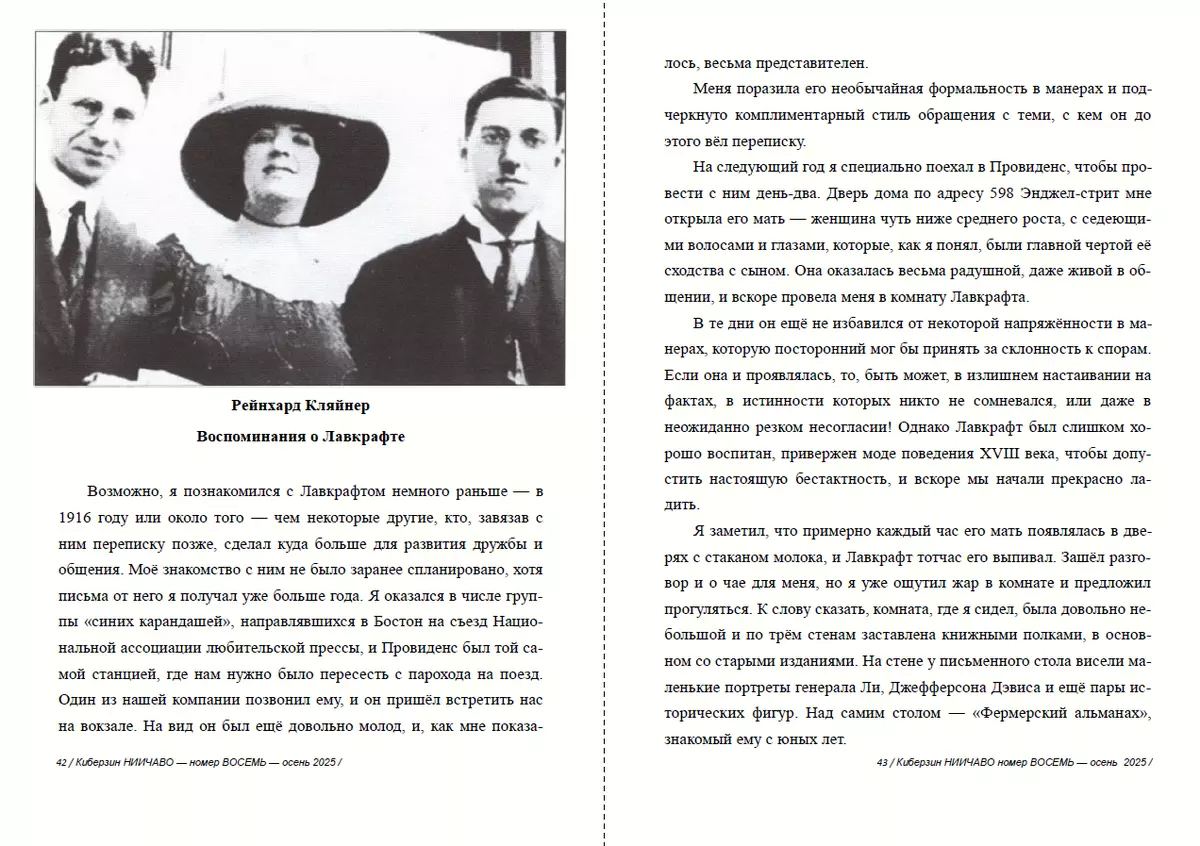 - Рейнхард Кляйнер. Воспоминания о Лавкрафте (статья, перевод А. Речкина), стр. 42-53