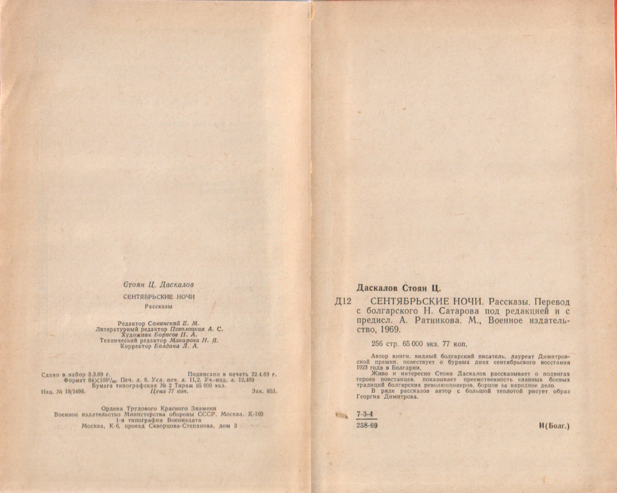 - Стоян Даскалов. Барельеф (рассказ, перевод Н. Сатарова), стр. 133-135