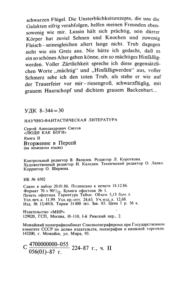 Примечание: Люди как боги. Книга вторая. Вторжение в Персей. Zuerst erschienen in der Anthologie «Вторжение в Персей». Verlag «Лениздат». Leningrad 1968. ИБ № 6502. Заказ 85. Сдано в набор 20.01.1986. Подписано к печати 18.12.1986. Цена 1 рубль 36 копеек. Отпечатано в Можайске.