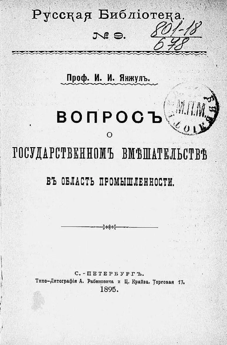 И. И. Янжулъ «Вопросъ о государственномъ вмѣшательствѣ въ область промышленности»