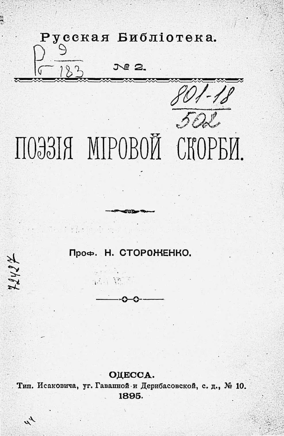 Проф. Н. И. Стороженко «Поэзія міровой скорби»