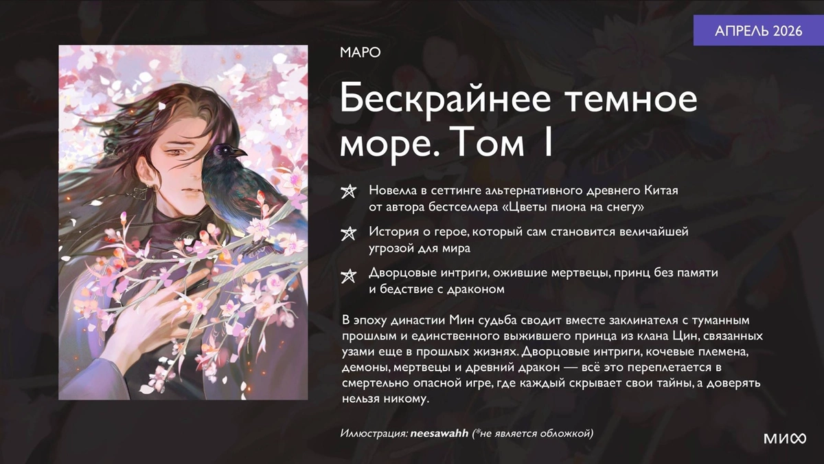 Описание: Первый роман цикла «Бескрайнее темное море». Примечание относительно планов: — Новелла в сеттинге альтернативного древнего Китая от автора бестселлера «Цветы пиона на снегу» — История о герое, который сам становится величайшей угрозой для мира — Дворцовые интриги, ожившие мертвецы, принц без памяти и бедствие с драконом Содержание: