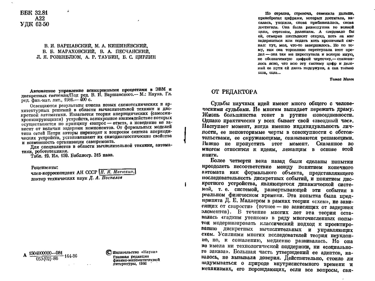 В. И. Варшавский, М. А. Кишиневский, В. Б. Мараховский, В. А. Песчанский, Л. Я. Розенблюм, А. Р. Таубин, Б. С. Цирлин «Автоматное управление асинхронными процессами в ЭВМ и дискретных системах»