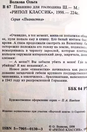 Описание: Третий роман цикла «Пианистка (Наталия Орехова)». Художник не указан. Содержание:
