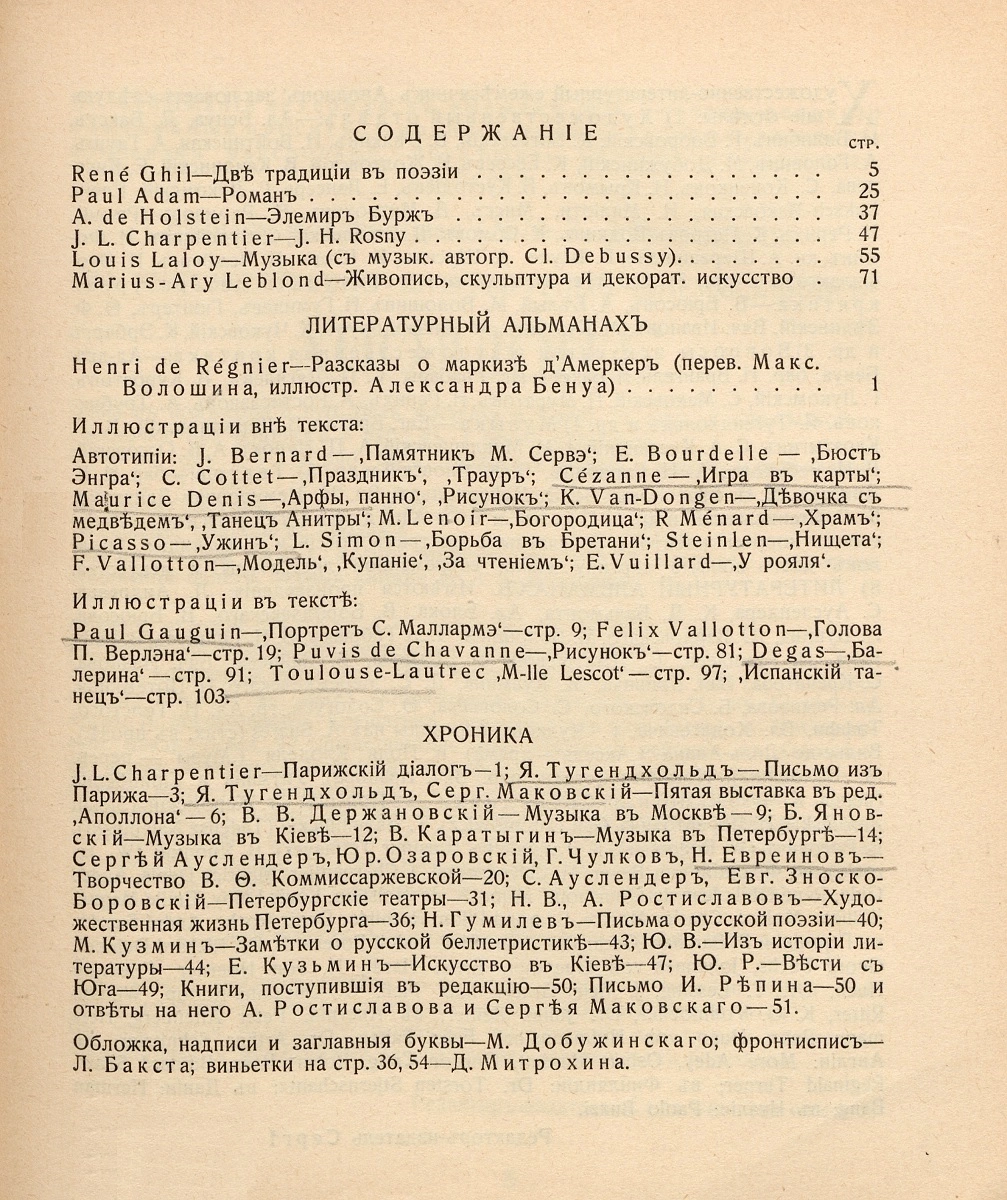 Paul Gauguin. «Портретъ С. Маллармэ» стр. 9; Fеliх Vallоttоn. «Голова П. Верлэна» стр. 19; Puvis de Chavanne. «Рисунокъ» стр. 81; Degas. «Балерина» стр. 91; Toulouse-Lautrec. «М-llе Lescot» стр. 97; «Испанскій танецъ» стр. 103.