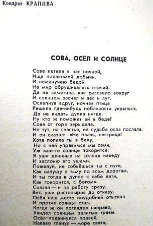 - Кондрат Крапива. Сова, Осёл и Солнце (стихотворение, перевод Я. Сашина), стр. 28-29