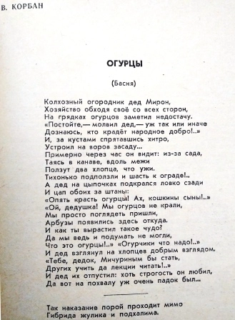 - В. Корбан. Огурцы (басня, перевод Б. Тимофеева), стр. 37