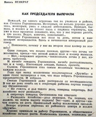 - Михась Пенкрат. Как председателя вылечили (рассказ, перевод Ф. Кравченко), стр. 3-7