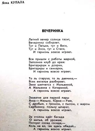 - Янка Купала. Вечеринка (стихотворение, перевод М. Исаковского), стр. 8-9