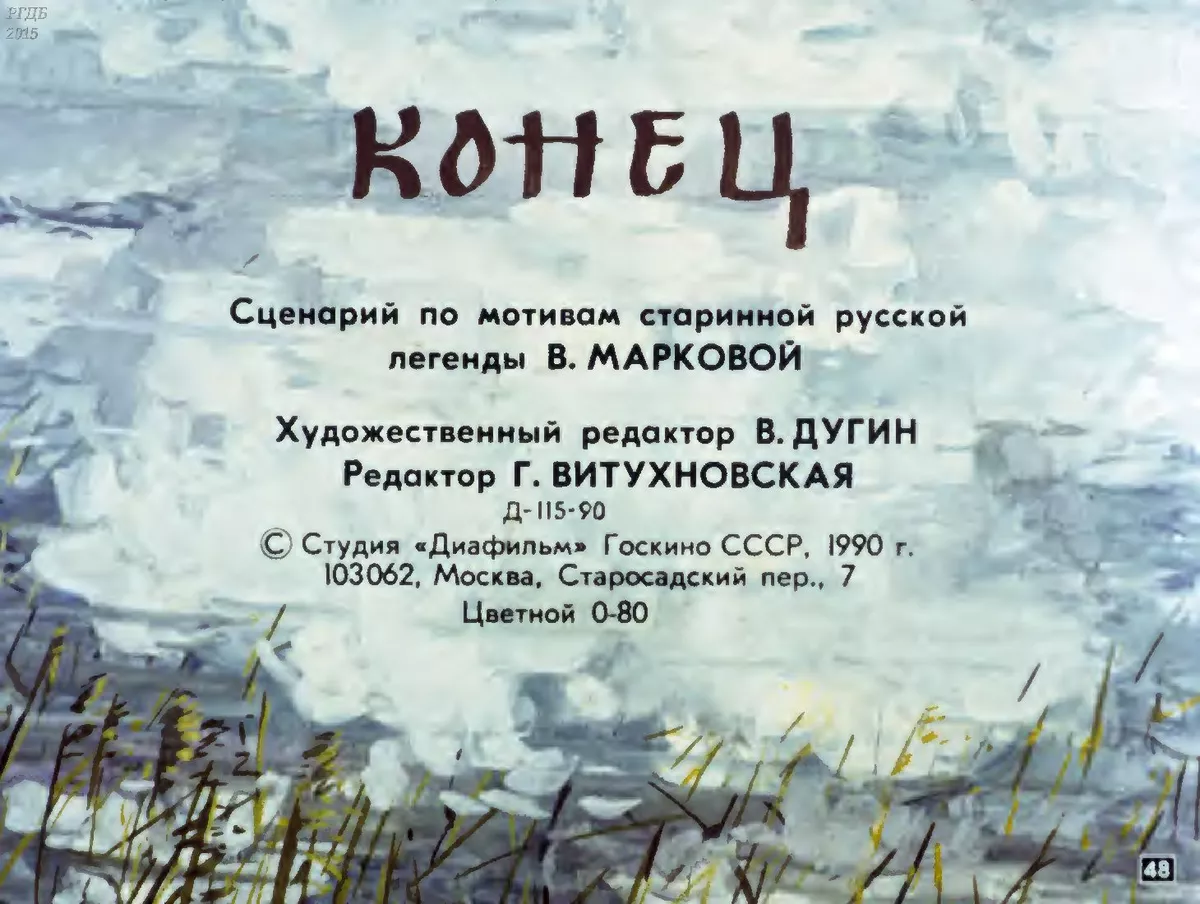 Описание: Диафильм по сценарию Веры Марковой по мотивам старинной русской легенды. Иллюстрации В. Маркина. Содержание: