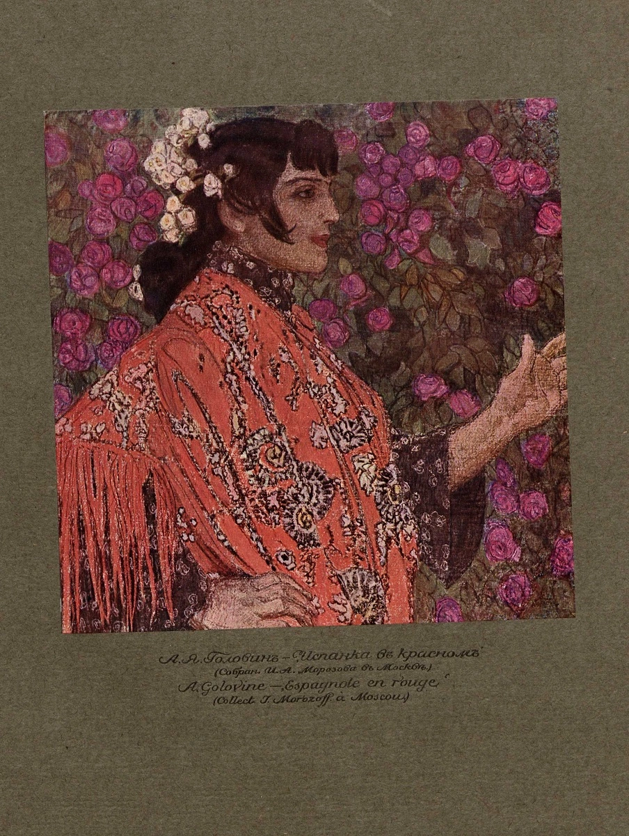 А. Я. Головинъ — Эскизы декорацій: для балета Корещенки «Волшебное зеркальце» (1901), для оперы Бородина «Псковитянка» два эскиза (1901), для драмы Ибсена «Маленьюй Эйольфъ» (1903), для драмы Кнута Гамсуна «У вратъ царства» (1904), для драмы Ибсена «Женщина съ моря» (1904); «Испанка»; эскизъ декораціи для оперы «Карменъ» (1906); портретъ Шаляпина въ роли «Бориса Годунова» (1912); пять эскизовъ декорацій для «Бориса Годунова» Мусоргскаго (1907); «Испанка» (1911); «Испанка» (1908); «Маркиза» (1908); «Испанка» (1908); три эскиза декорацій для «Орфея» Глука (1911); декоративное панно въ Московскомъ музеѣ имени Императора Александра III (1912); «Прудъ въ чащѣ» (1909); «Березы» (1908); «Лѣсной прудъ» (1909); «Ветлы» (1909); портреты: М. А. Кузмина (1910), г-жи Смирновой (1910), М. Э. Маковской (1912); «Прудъ» (1910).