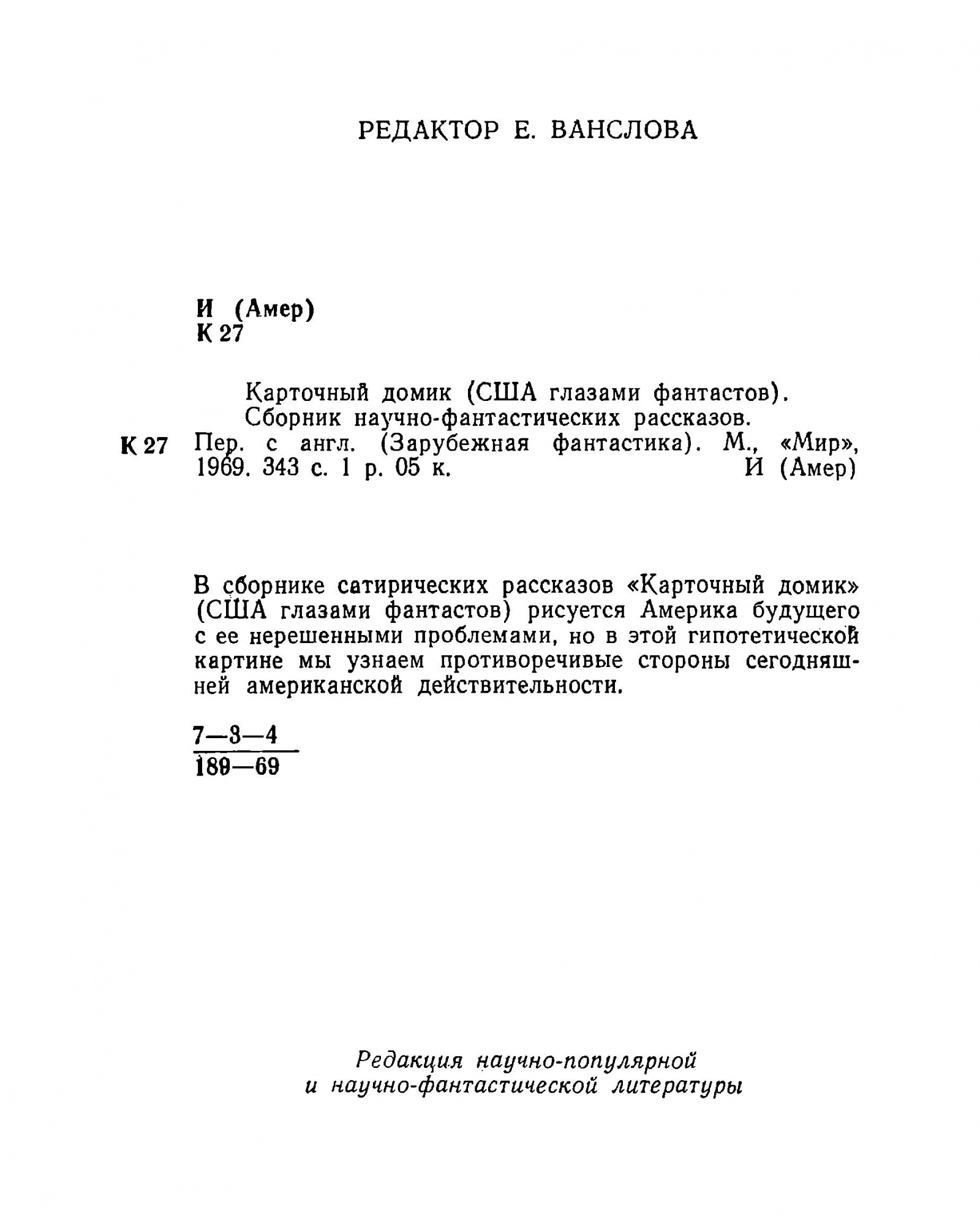 - Сирил М. Корнблат. Карточный домик (рассказ, перевод С. Михайловой), стр. 5-17