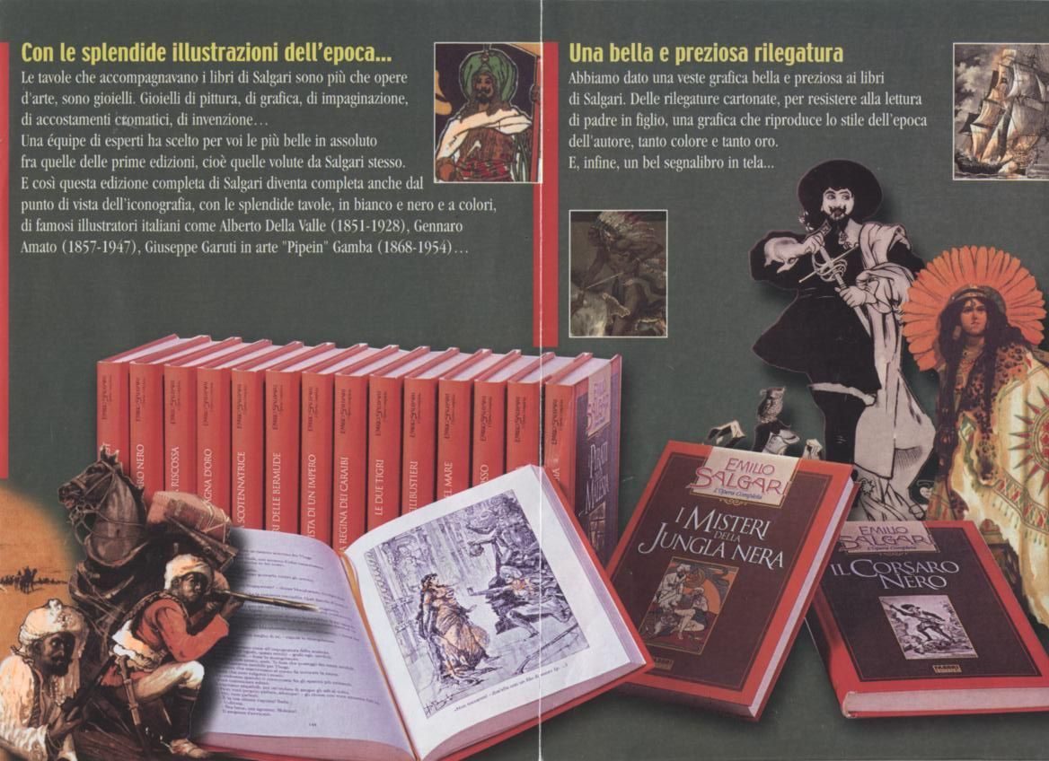 Это рекламный листок собрания сочинений мэтра приключенческого жанра Э. Сальгари, изданного в Италии. Будучи на его родине, я привез оттуда многие романы этого выпуска. В России, в Волгограде, ранее, в 1991 году, мы издали многие его романы, (каждый том тиражом 100 тыс экз). В том входило несколько романов. К ряду его произведений, опубликованных в Волгограде, Ярославле (Издательство В.В. Мамонова), мною написаны статьи о жизни и творчестве Эмилио Сальгари.