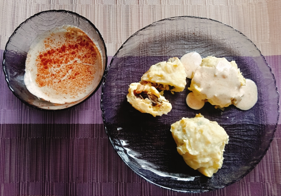 Вся фишка в том, что в тесто, в отличие от драников и колдунов, идет не только сырая тертая картошка, но и мятая вареная. Ну и, как обычно, яйцо, мука. Сделала попробовать, из-за яйца тесто получалось жидковатым для скатывания и требовало больше муки. Но я же не такая , плюнула на красоту и вместо отваривания воспользовалась пароваркой. Поэтому получились уродцы. Но нам же только попробовать. Ну да, тесто немного другое, не как у колдунов, но делать их из-за отваривания картошки на 15 минут дольше (я ж картошки сразу на несколько блюд наварила, селедку под шубой с ней тоже сегодня ели). Сложности, однако. Повторять не буду, колдуны вкуснее и проще. Начинка — жареные грибы, лук. А вот соус действительно понравился: сметана, горчица, паприка для цвета.