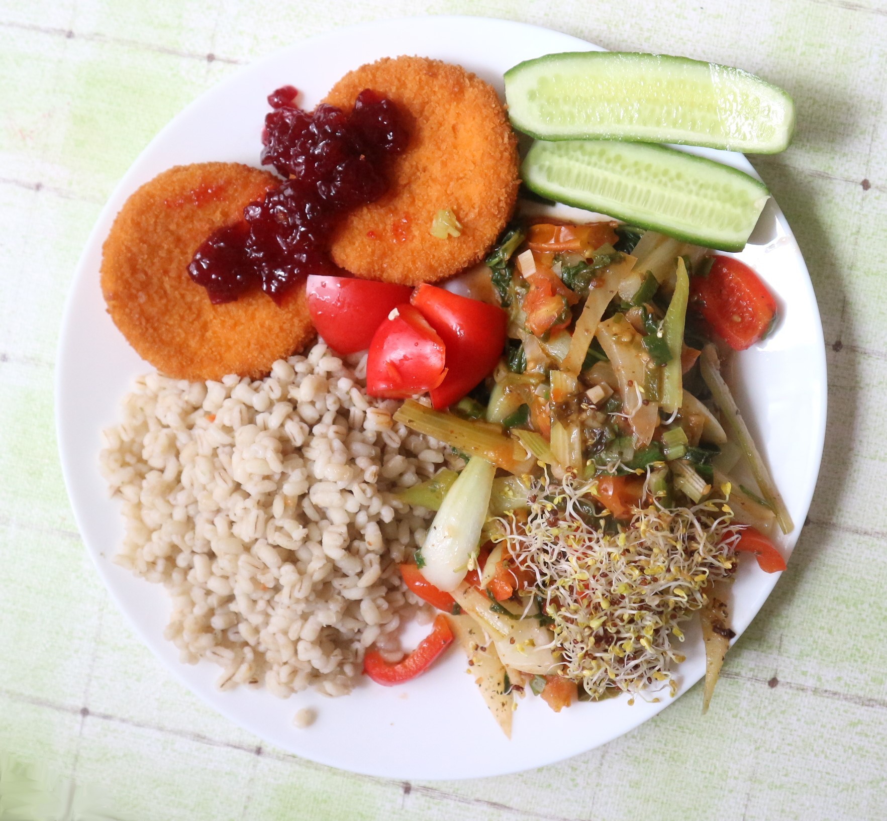 Сегодня жена хотела приготовитьь тофу по рецепту снохи. Но после врачей настроение у ней пропало и она попросила меня поджарить камамберты. А сама достала их морозилки перловку и прочее. Добавила перчик и огурчик. Обед готов!