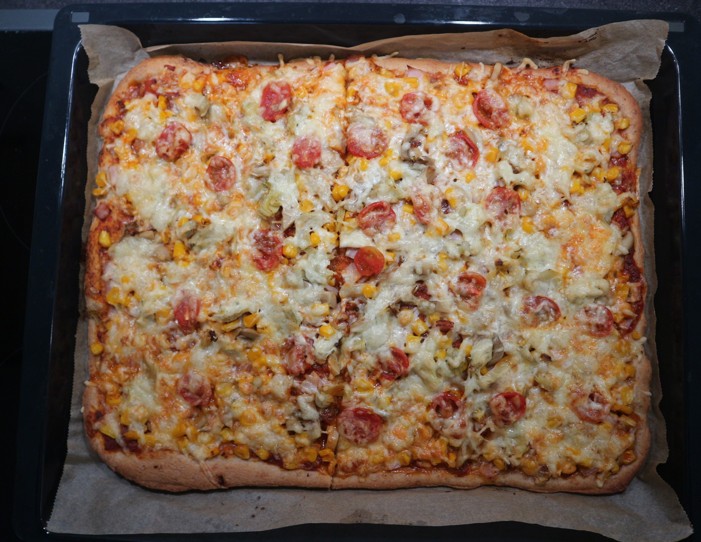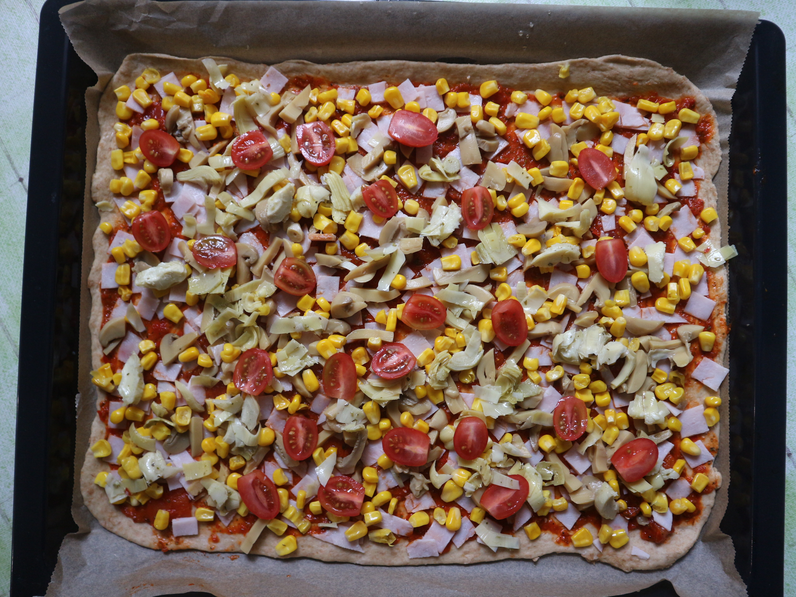 Сегодня сделали пиццу. Вдвоем и на два раза. Цельно зерновая мука: 350г. Вода 150 мл. 2 ст. ложки оливкового масла. Наверх: намазка, буженина, грибы, артишоки, кукуруза, мелкие томаты, сыр.