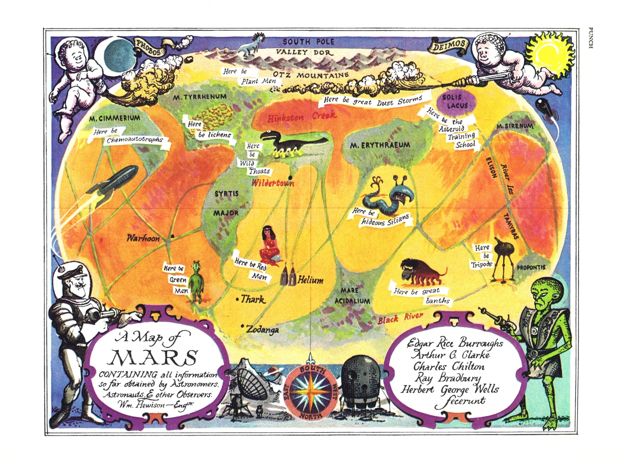 Фантастическая сборная карта Марса, журнал "Punch", №6032, 1956 год. Составлена на основе произведений писателей-фантастов первой половины XX века. На реальном ландшафте Марса (насколько он были известен астрономам 50-х), расположились страны и существа со страниц произведений Уэллса, Берроуза, Брэдбери, Артура Кларка и Чарлза Хилтона