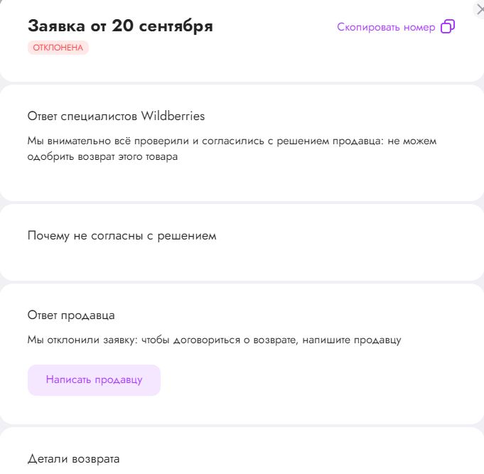 Я оспорил заявку и написал сообщение продавцу (там же, через форму возврата). Продавец молчит, а сегодня ответил ВБ: