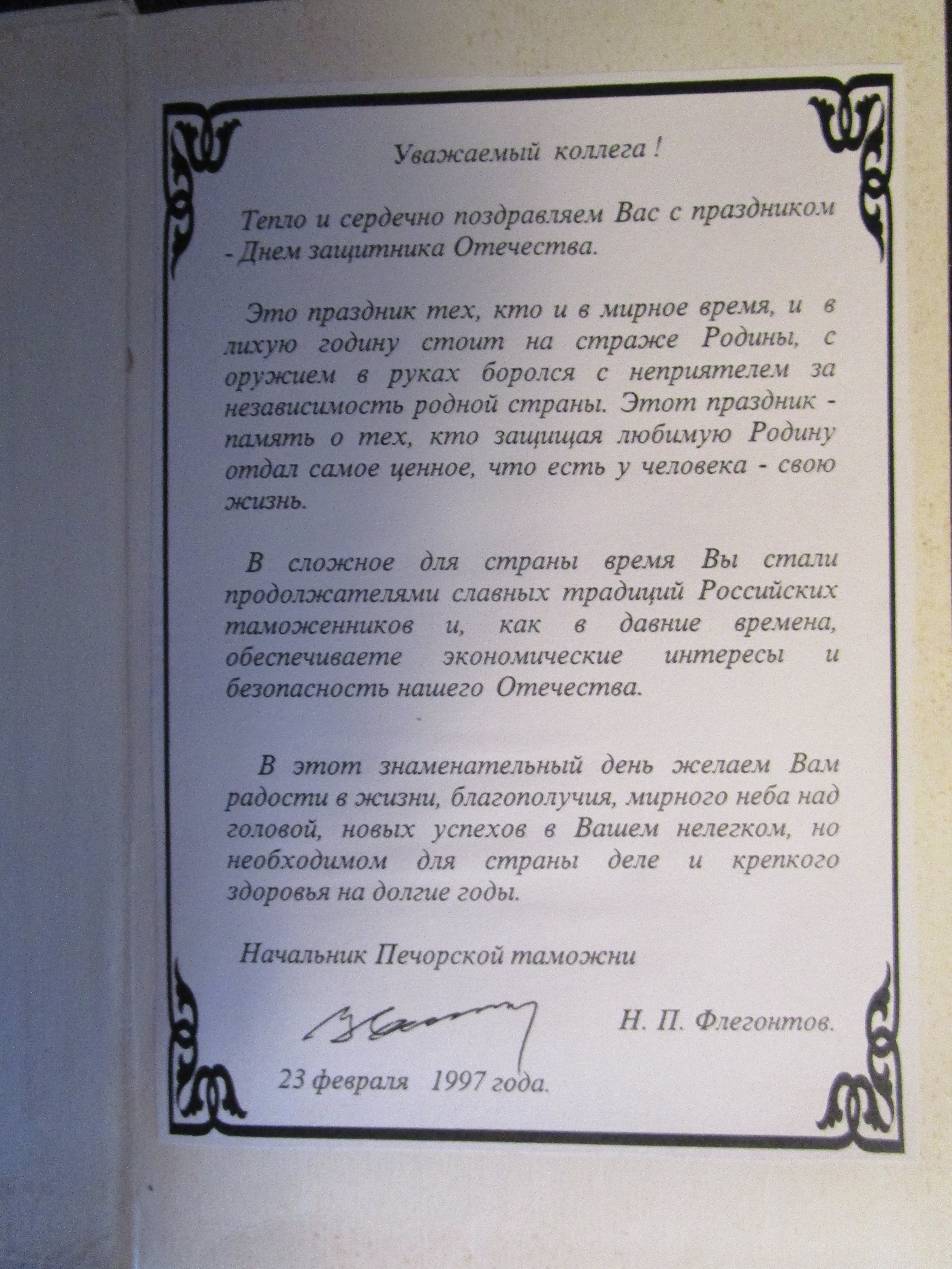 Книга с приклеенной напечатанной (да не много не по теме) посвятительной надписью 23 февраля. Начальник Печорской таможни поздравил сослуживца с праздником.