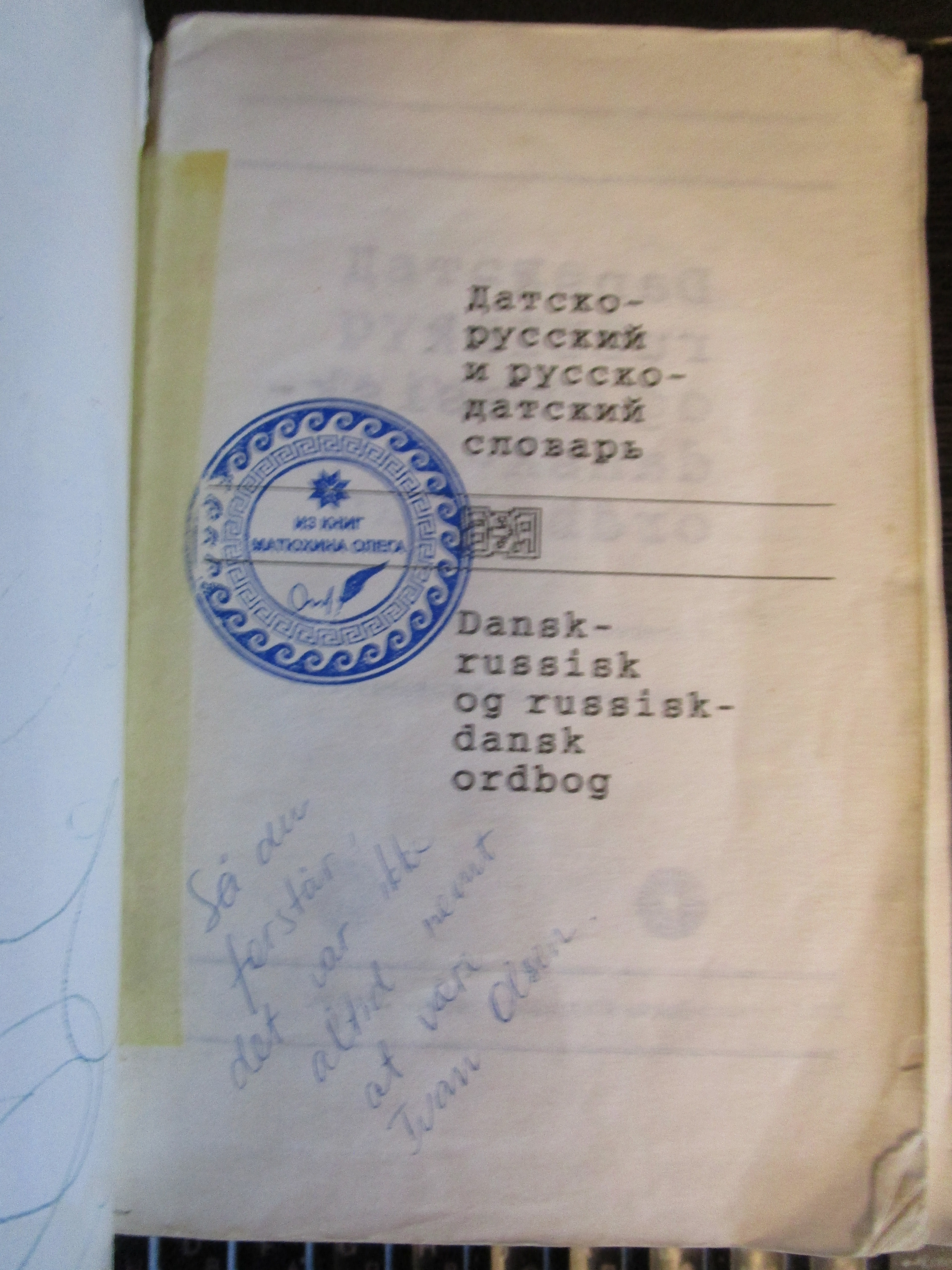 Дарственная надпись по датски в "Русско-датском и датско-русском словаре". Написано следующее: "Så du forstår det var ikke altid nemt at være. Ivan Olsen" В переводе: "Теперь вы понимаете, что не всегда было легко. Иван Ольсен" Эта подпись оставлена преподавателем датского языка ПсковГУ в начале 00-ых.