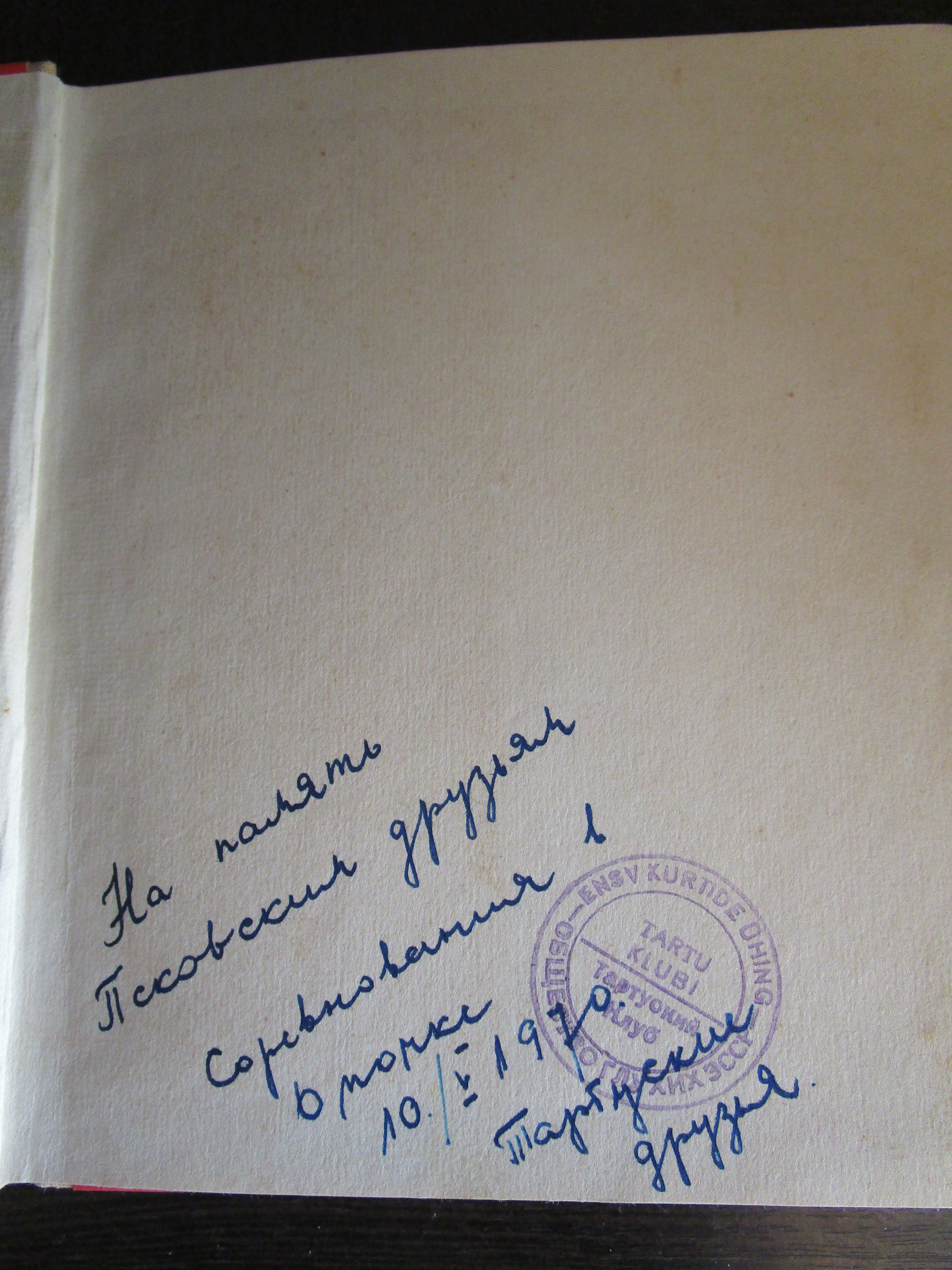 "На память Псковским друзьям соревнования в Опочке 10/V 1970 Тартуские друзья" Печать тартуского клуба общества глухих ЭССР.