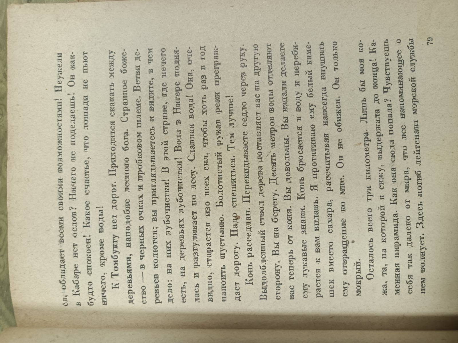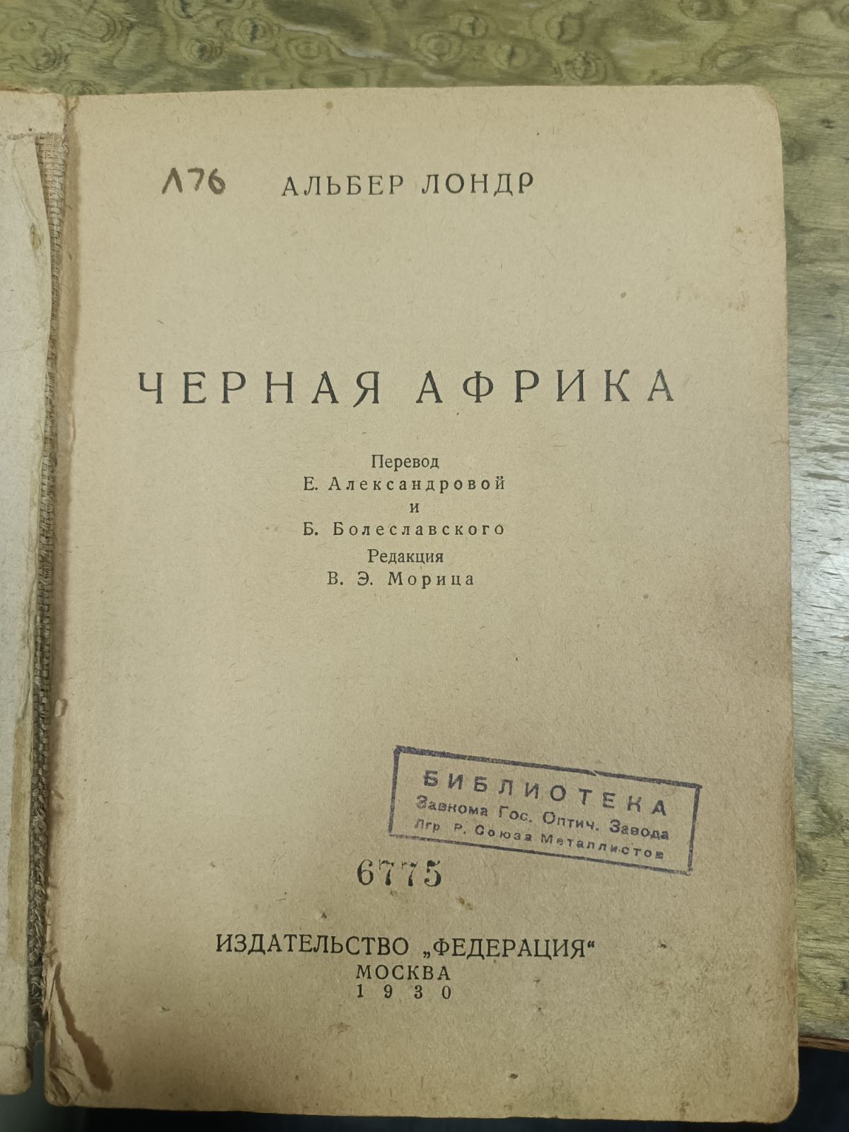 Книга 1930 года — "Чёрная Африка" Альбера Лондра. Автор — французский военный корреспондент, был чрезвычайно популярен на родине, в 1932 году (после его гибели) учреждена журналистская премия его имени. Погиб во время пожара на судне «Жорж Филиппар» у берегов Йемена Удивительно, что в СССР того времени была издана почти сразу же после выхода во Франции в 1928 году. Описывается путешествие по Африке начиная с Судана, нравы местных племён, нравы колониальной администрации. Направленность — остро критическая по отношению ко всем. Нравы дикие — жёны одного из местных царьков вползают в дом на четвереньках (так принято), администрация ничего не делает для искоренения дикости и невежества, а если и делает, то на выходе получаются охраняемые резервации по типу североамериканских. Найдена книга не помню где, но точно в далёком от подобающего книгам места. От обложки почти ничего не осталось.