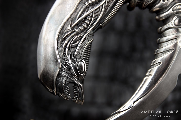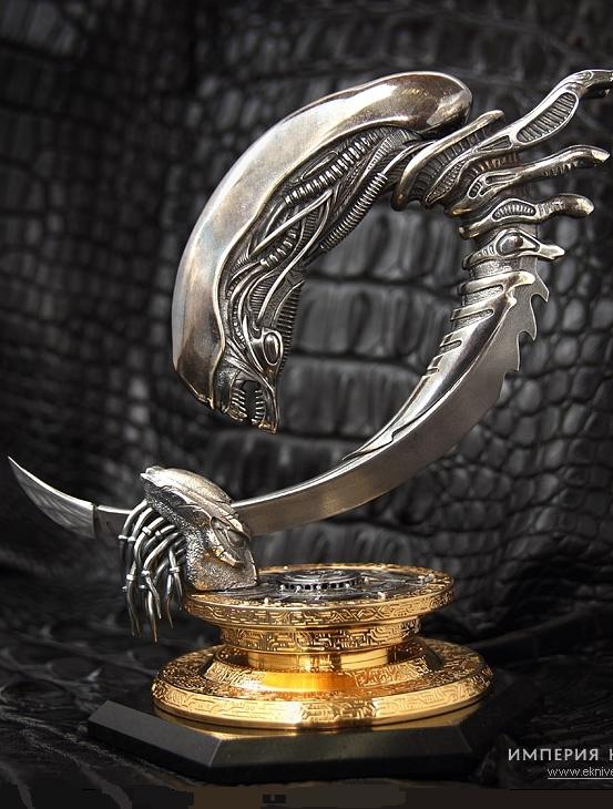 Нож для настоящих ценителей агрессивной красоты и классики кинематографа! Филигранно выполнен по мотивам фильма "Чужой" в виде устрашающего инопланетного существа, пронзающего своим ядовитым хвостом голову "хищника". Нож вызывает настоящий трепет,когда держишь его в руках или ставишь на специальную подставку, которая сама по себе-произведение искусства. Авторы смогли передать всю мощь и и притягательность как фильмов, так и самого ножа.