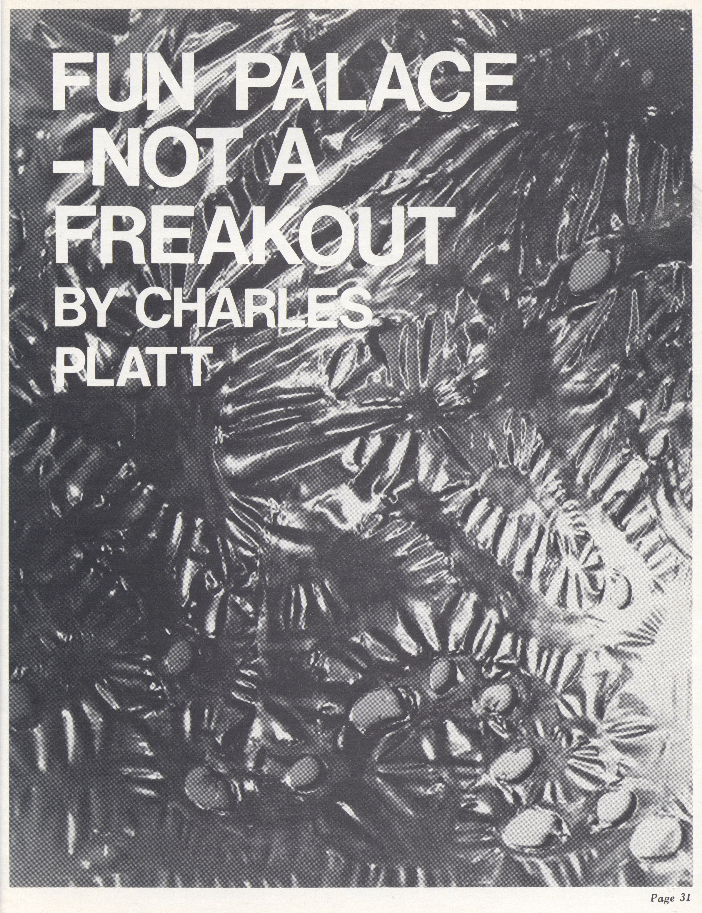 Платт: Я вообще не имел дела с людьми из Frendz. У меня не было времени. Мне приходилось зарабатывать не менее 50% от моей прожиточной зарплаты вне New Worlds, потому что Майк не мог позволить себе платить мне достаточно, чтобы прожить. Я заказывал иллюстрации и фотографии (которые часто оказывались не в том виде, в котором я ожидал, и требовали дополнительной работы). Поначалу я собирал 64-страничный журнал без какой-либо помощи, и нам всегда не хватало визуального материала. Я делал заголовки Letraset и, конечно же, обложку. Это было занятие на полный рабочий день. У нас было очень четкое разделение труда: Майк и его коллеги-писатели занимались всем, что касалось содержания. Я занимался визуальными эффектами. Часто у меня даже не было времени читать журнал!
