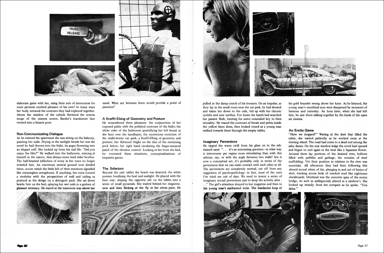 Больше всего Балларду понравился выпуск NW № 186 , потому что я проиллюстрировал его рассказ «Летние каннибалы» так, как он считал очень уместным. Множество маленьких картинок, имитирующих способ, которым его рассказ был разбит на небольшие разделы. Он сказал, что хотел бы, чтобы мы могли публиковать все его рассказы таким образом. Я тоже! Но это был невероятный объем работы, поиск подходящего материала. Тогда не было интернета. Никаких стоковых фотографий. Просто вырезание картинок из автомобильных каталогов и журналов. Легко понять, почему ему понравилась эта презентация. В его взгляде на мир (и, вероятно, моем тоже) медийный ландшафт создает эквивалентность между изгибом бедра и контуром автомобильного листового металла, и автокатастрофа становится извращенным эротическим событием. Я очень хорошо понимал его видение, и у меня было уникальное преимущество в том, что мой отец был директором британского производителя автомобилей. Это позволило мне легко получить фотографии автомобильных краш-тестов И американские автомобильные каталоги. Идеально! Добавьте сюда извилистые формы развязок на автомагистралях, обнаженную модель и крупные планы века и пары губ (все беззастенчиво украдено из опубликованных источников), и вот вам результат.