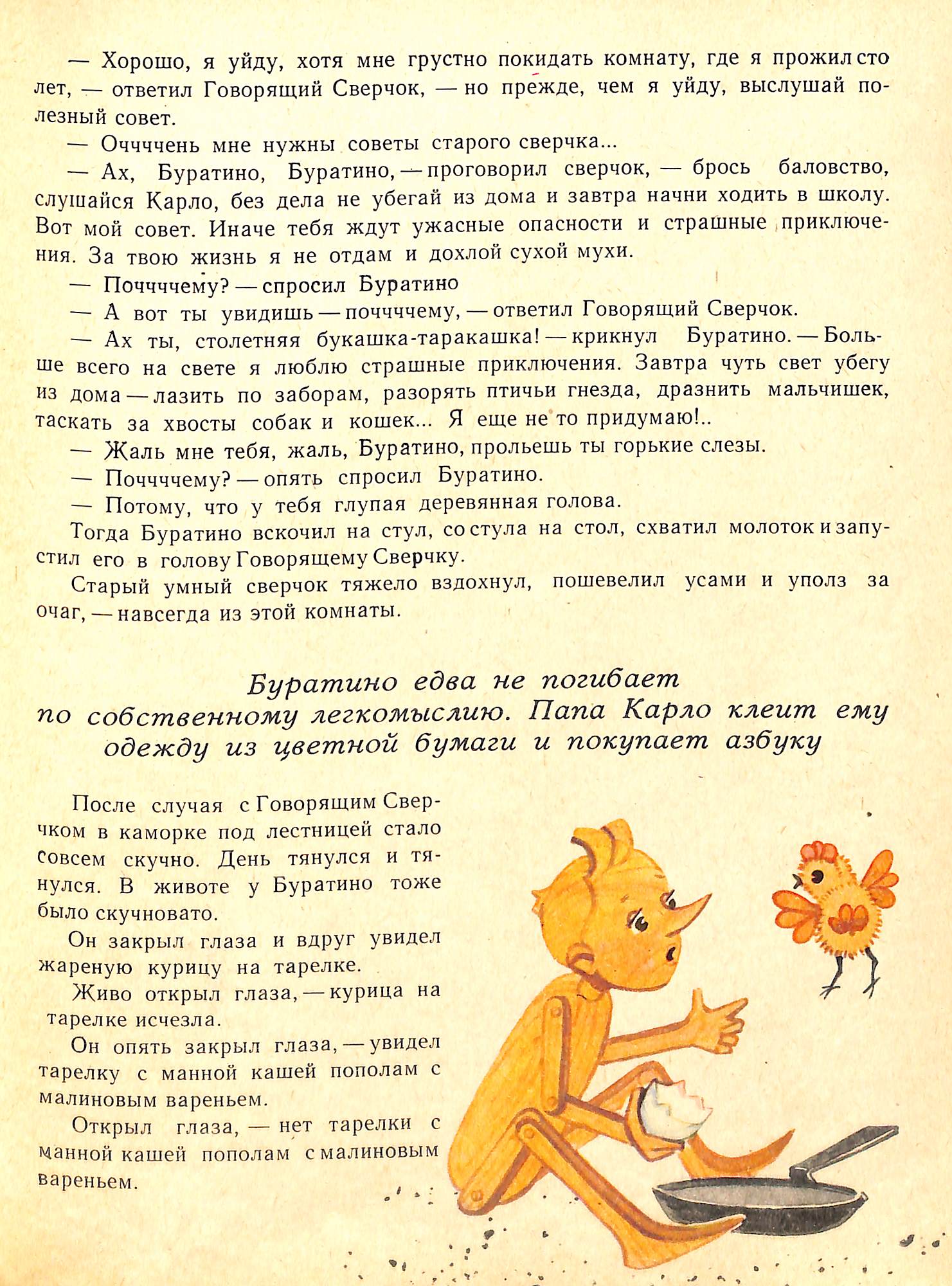 а) Чёткая линия Калачева: сизый нос присутствует, Папа Карло держит нож, Буратино улыбается. Все эти фигуры — по шаблону художника, без попытки наделения характером.