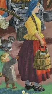 Ещё другие иллюстраторы в первых картинках про Кокованю с Дарёнкой рисовали пейзажи. Бычкову этого не надо: он природу и пейзажи уже отдельно нарисовал (и будет потом ещё рисовать). В первых жанровых сценах Бычков рисует детали обувки, показывает половички в избе, технику сидения на завалинке...