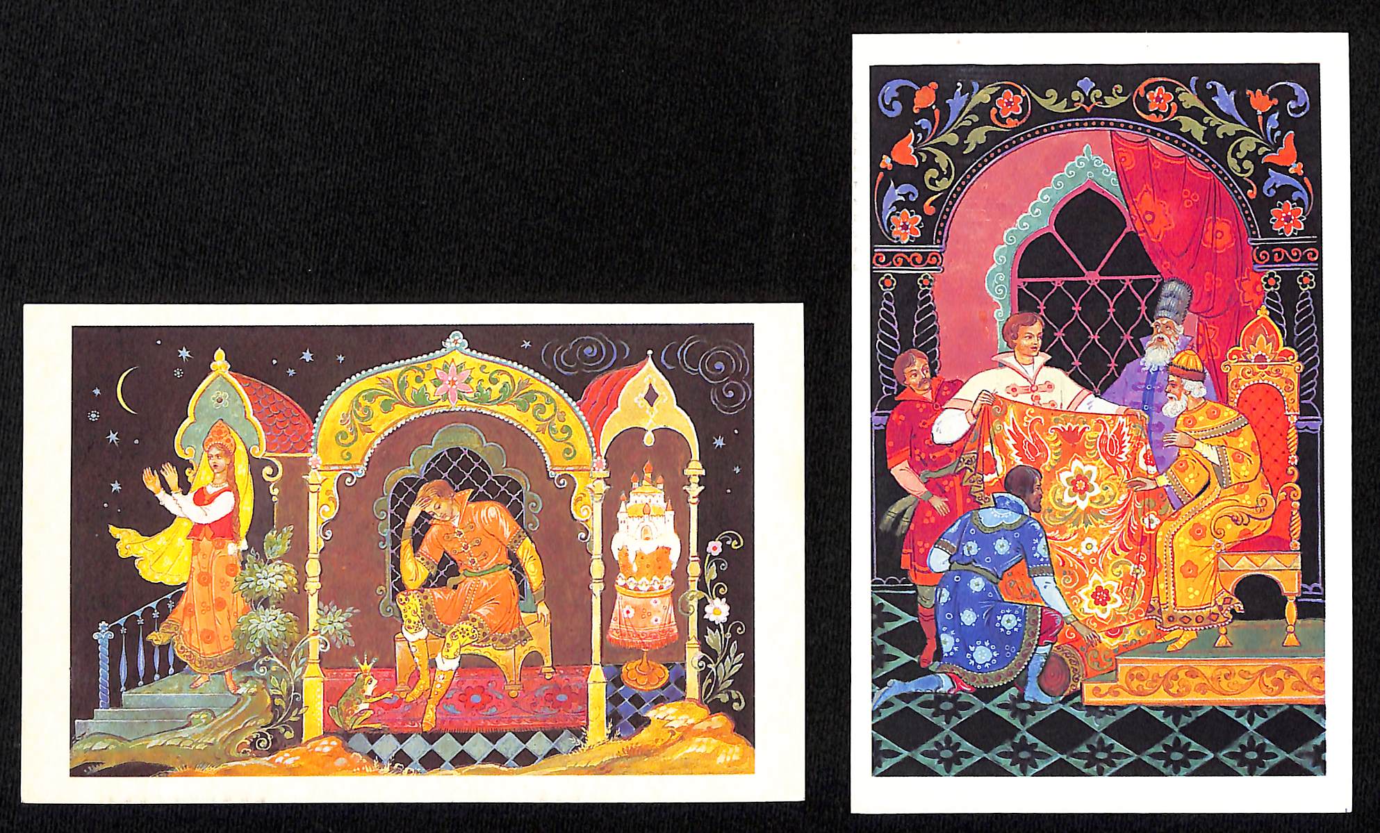 1) "Царевна-лягушка". Набор открыток (М.: Изобразительное искусство, 1987). Художник К.Бокарев (Палех).
