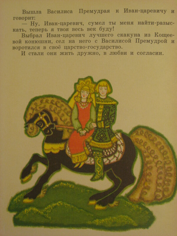 По иллюстрациям. Они красивые. В такой манере в 1970-е гг. делали советские кукольные мультики для самых маленьких. Плотная заливка цветом, узоры-завитушки. Основа — русские народные росписи, поданные через посредничество Ю.Васнецова. В общем, матрёшки для иностранцев. Добротная умиротворяющая стилизация.