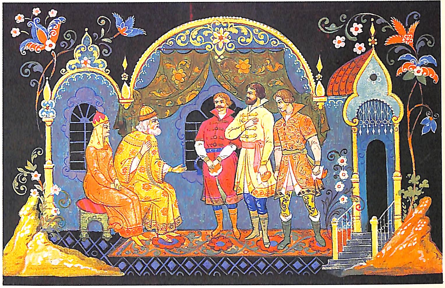 Зато все художники подробно остановились на выполнении невестками царских заданий. Ключевой фрагмент здесь — танец Василисы Премудрой.