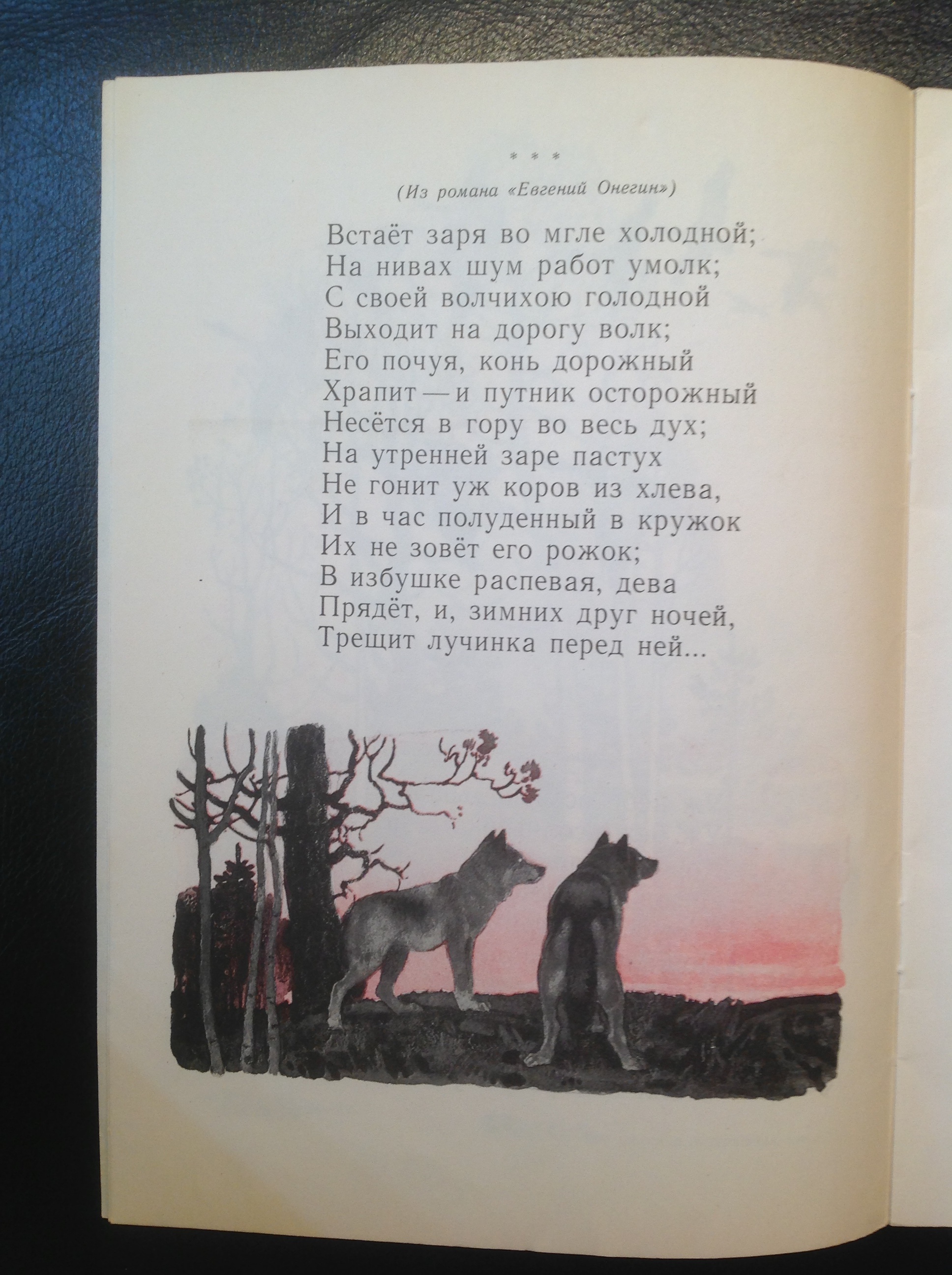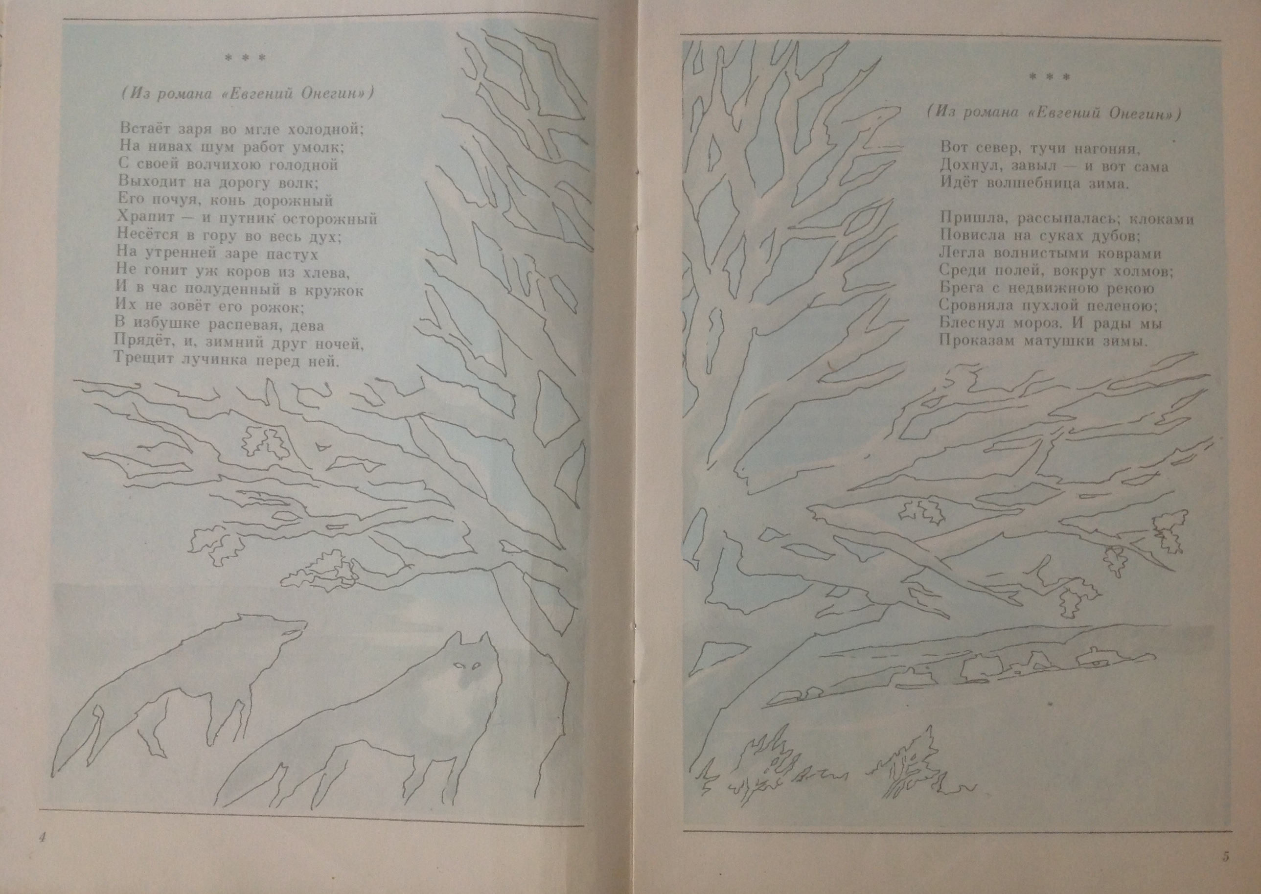 Из Пушкина только три стихотворения: два отрывка из "Онегина" и "Зимнее утро". Каждому посвящёно по книжному развороту.