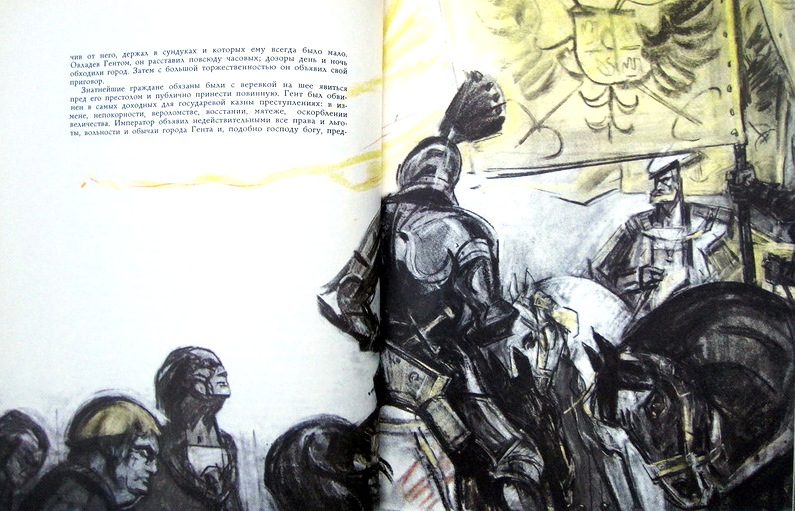 Художник И.Кусков многими любим как память детства: он много иллюстрировал приключенческой подростковой литературы. У меня таких воспоминаний нет, все его иллюстрации к "Уленшпигелю" выложены на Фантлабе: https://fantlab.ru/edition51181. Две картинки для ознакомления: цветная и и чёрно-белая с центральной сценой у столба. Рисунок сожжённого Клааса сделан в соответствии с альбомом по судебной медицине: "поза боксёра".