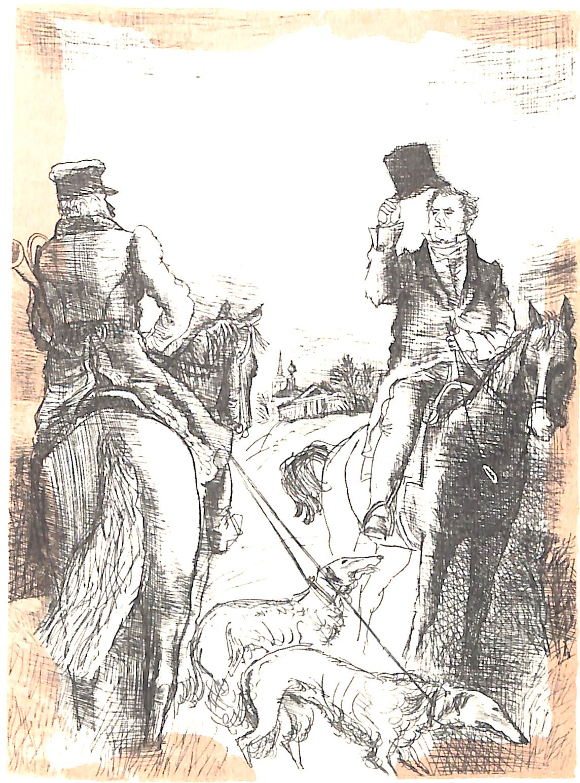 1) Пейзажики ("Деревня" и следующее стихотворение "Домовому"). На картинках ничего не разобрать — но такова была задумка "Избранных произведений" 1959-го года: огромный том с маленькими гравированными картинками плохого качества. А по существу — и здесь художники игнорирнуют тему обличения барства.