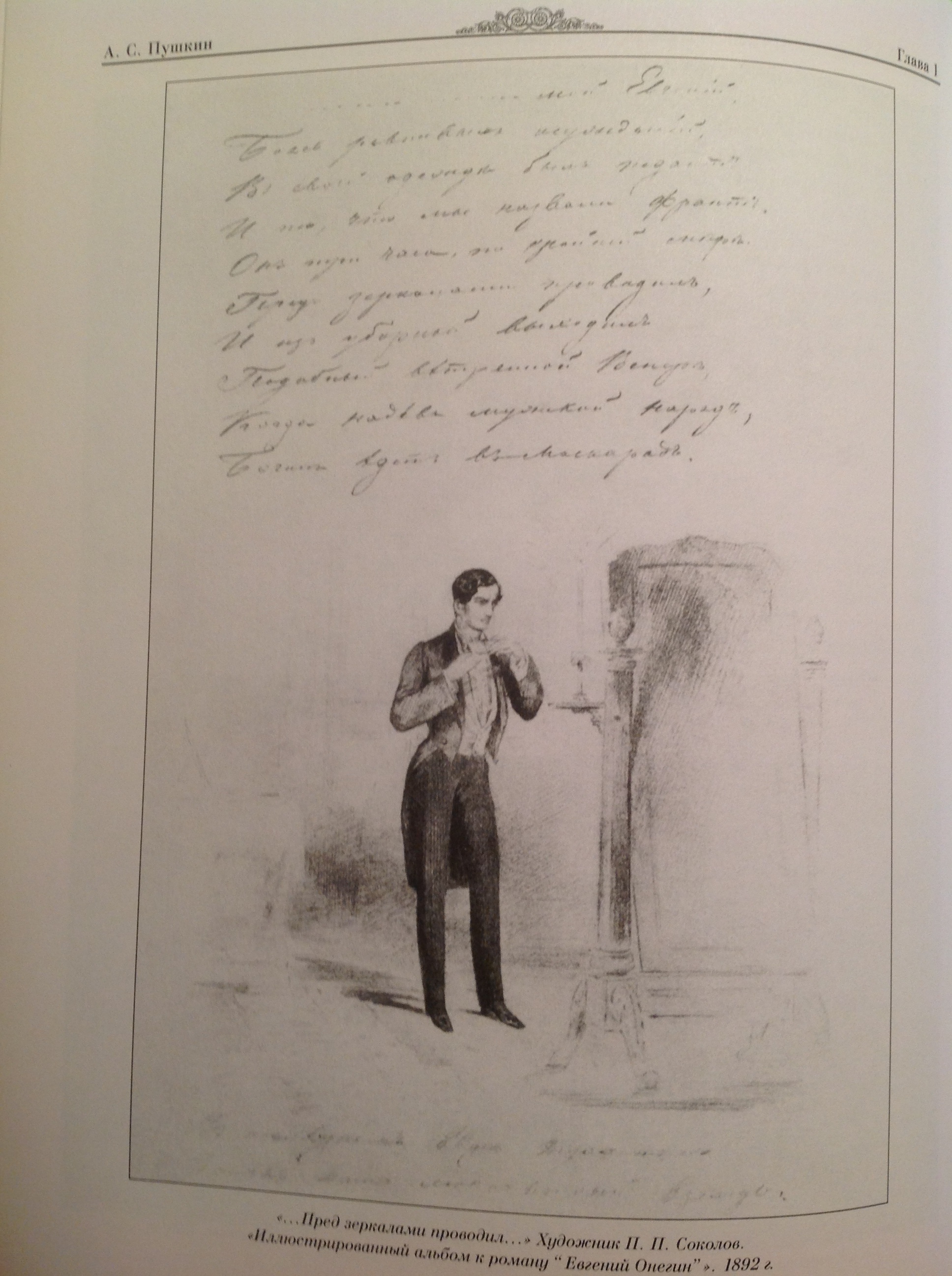 Например, оказывается, что воображаемая сцена с онегинским дядюшкой ("печально подносить лекарство...") — это не находка современных продвинутых постмодернистов, она есть у Соколова. Но у Соколова она изображена в примитивной манере: вот повеса летит на почтовых, вот пыль, а вот в "облачке" то, о чём повеса думал. Позднейший прорыв в книжной графике нужен был, в том числе, и для того, чтобы художники перестали рисовать такое "облачко" ("облачко", как известно, нужно для того, чтобы в него впечатывать речь героя в комиксах).