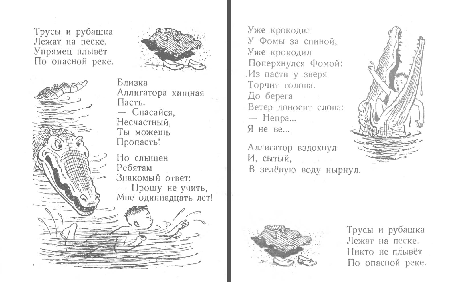 В скудную на литературу ужасов советскую эпоху эпизод со сном Фомы, где его заглатывает крокодил на реке Конго очень будоражил воображение малышей. Художники не упускали возможности поупражняться в дозволенном хорроре. Впрочем, у всех иллюстрации получились не страшные, а забавные. Психологизма тоже особого нет — крокодилы неэмоциональны. Комментировать нечего, а отснятые картинки выбрасывать жалко (все картинки кликабельны).